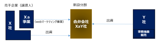 そのままXa事業を「事業譲渡」方式で譲り受けるのがシンプルなのですが、Y社にとってはいくつかの不安要素が残りました。①譲渡価格は適正か、②譲渡後すぐに社員が辞めたりしないか、③ノウハウ、顧客をスムーズに引継ぎできるか、④売手はきちんと引き継ぎ実務をしてくれるか・・・等です。考えたらきりがなく、大幅な価格交渉か、案件を見送ることまで検討していました。