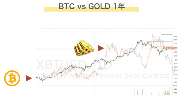 これについては、私も研究中で確実な事は言えないですが、一般的な金融商品の資金循環の一部に仮想通貨が加わりつつあると考えています。例えば、金とビットコインの価格に逆相関率が徐々に高まっています。下記の過去1年チャート比較を見ても、常に逆相関しているというよりは、ビットコイン売却時の退避先の1つとして金が買われている印象です。