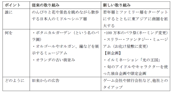 さて、マーケティング戦略として先ほど述べた「誰に」「何を」「どのように」の3つで従来の取り組みと新しい取り組みを比較します。