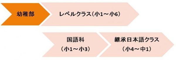 今:幼稚園児向けには幼稚部があります。小学生向けにはコースが分かれていて、小学1~6年向けに各学年ごとに6クラスあるレベルクラス、小学1~3年向けの国語科があります。さらに、継承日本語クラスが2クラス(小学4、5年向けクラス、小学6年・中学1年向けクラス)あります。