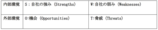 企業をとりまく環境を、内部環境である自社の強み(Strengths)・弱み(Weaknesses)、外部環境である機会(Opportunities)・脅威(Threats)に分けて情報を整理、分析する手法です。