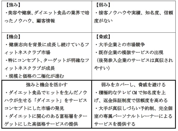 ここにライザップがフィットネスクラブ市場に進出するチャンスがありました。2012年当時のライザップのSWOT分析からは、新しく発見した2つのKSFを取り入れた、ライザップだからこそできる市場機会の発見を見ることができます。