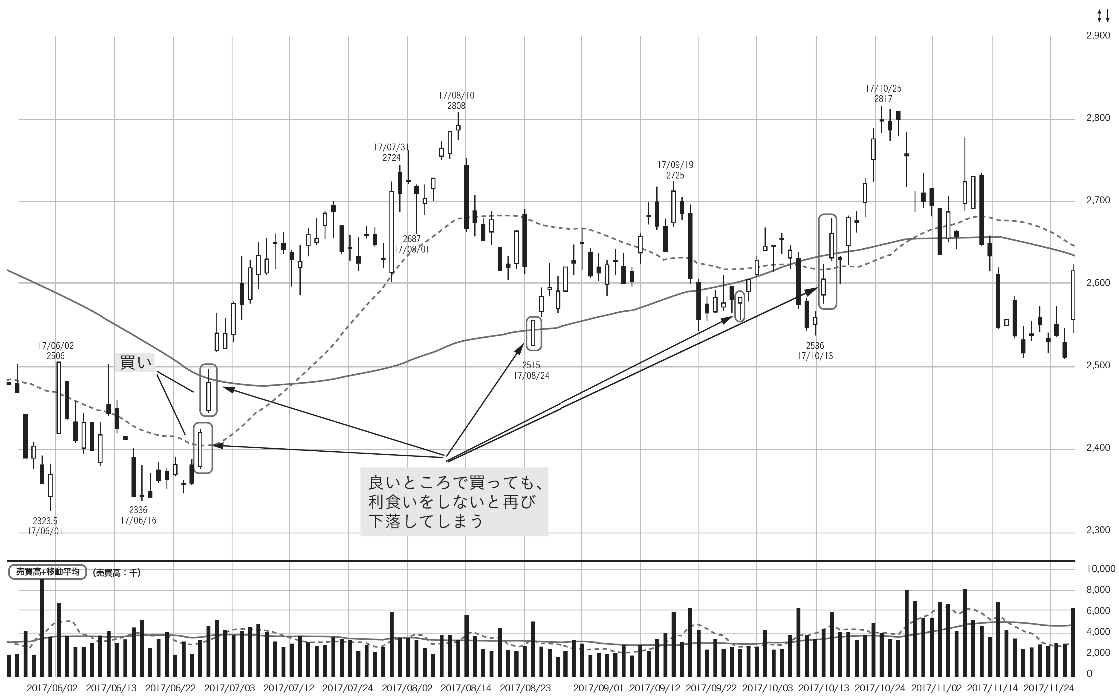 ただし、なんでもいいからとにかく急いで売ったほうがいい、ということではありません。あくまで、チャートの形や移動平均線と株価の位置、その他の材料など総合的に判断して、売る根拠があったときには速やかに売るべきだ、という意味です。