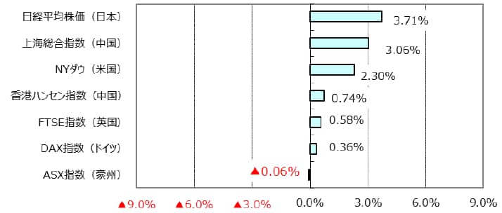 主要国の株式市場は概ね上昇しました。米国株式市場は、前週末に340億ドル相当の米中双方の輸入に対する関税が発動されたことで、悪材料出尽くし感が広がりました。トランプ政権が2,000億ドル相当の中国製品に対して10%の追加関税を賦課する方針を明らかにしたことで、週半ばに下落する場面もありましたが下落は一時的でした。NYダウは週間では2.30%上昇しました。日本株式市場では、日経平均株価は、円安や海外株高を好感して堅調に推移しました。トランプ政権が2,000億ドル相当の中国製品に対して10%の追加関税を賦課する方針を明らかにしたことで下落する場面もありましたが、前週まで貿易摩擦激化を懸念して大幅下落していたこともあり影響は限定的となりました。週間では日経平均株価は3.71%上昇しました。欧州株式市場では、ドイツDAX指数、英FTSE指数が上昇しました。中国株式市場では、トランプ政権が2,000億ドル相当の中国製品に対して10%の追加関税の賦課を発表しましたが、悪材料出尽くし感などから上海総合指数、香港ハンセン指数はともに上昇しました。