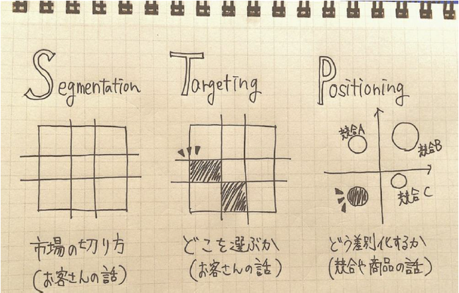 これはマーケティング界で有名なフィリップ・コトラー博士が提唱した代表的なフレームワークの1つで「セグメンテーション(Segmentation)」「ターゲティング(Targeting)」「ポジショニング(Positioning)」の3つのステップで作られています。