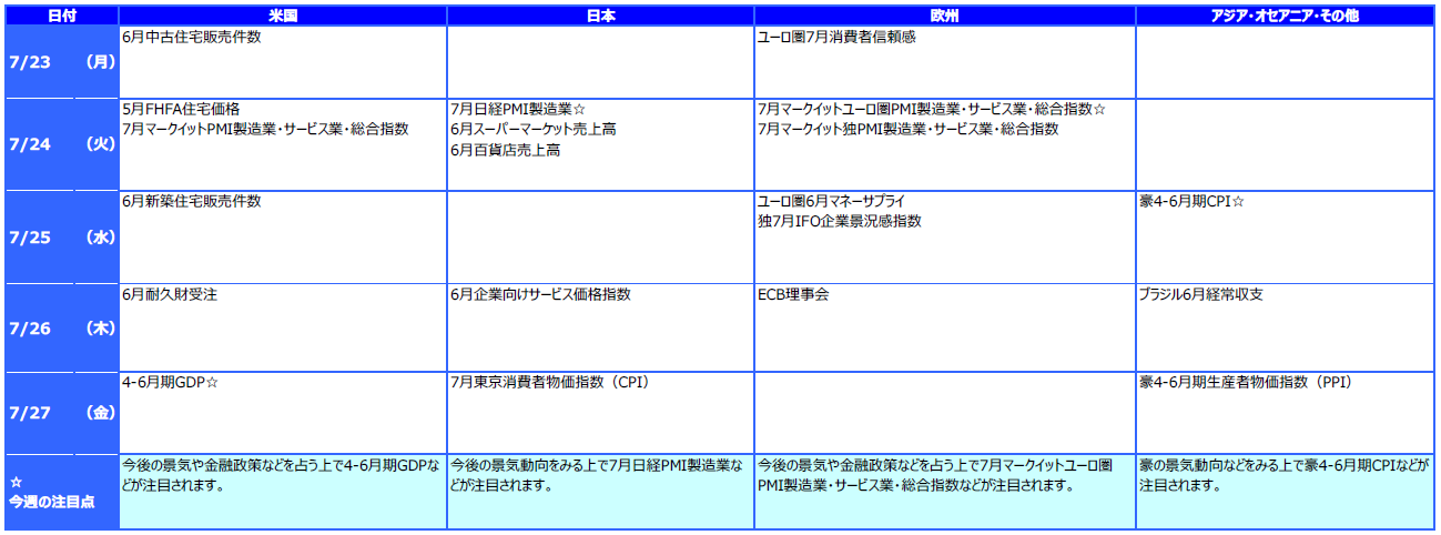 三井住友アセットマネジメント株式会社が、2018年7月16日~7月20日のマーケットについて振り返り、「1. 先週の市場動向、2. 先週のマーケット・デイリー/ウィークリー、3. 今週の主な注目材料」のそれぞれについて解説します。今回は、「3. 今週の主な注目材料」を見ていきましょう。※本連載は、三井住友アセットマネジメント株式会社が提供するマーケットレポートを転載したものです。