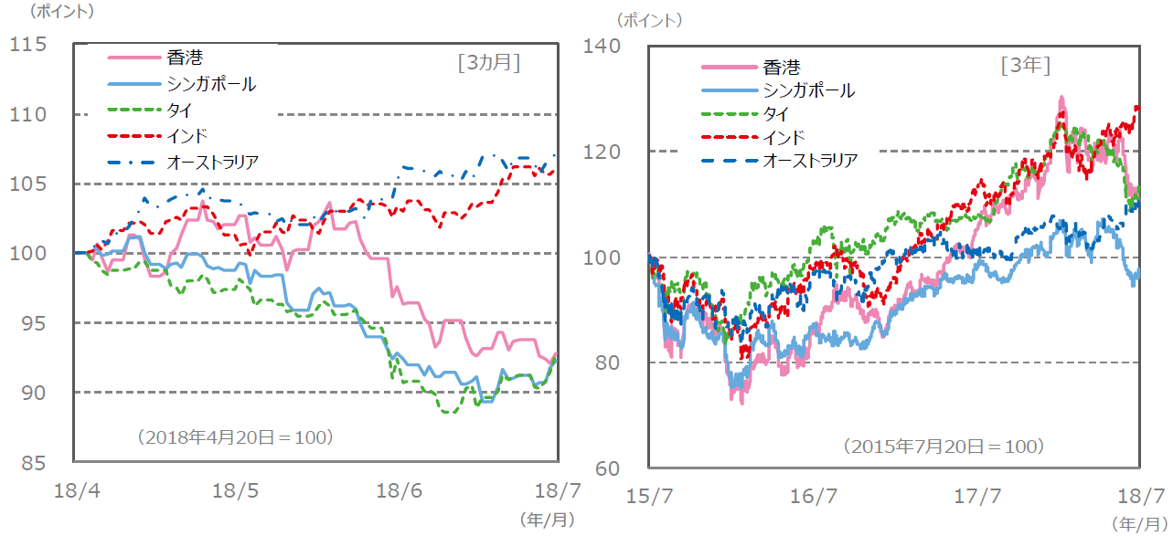 先週のアジア株式市場は、中国経済の減速懸念や人民元安などが圧迫要因となり下落する市場がある一方、好調な米企業決算などを受けて上昇する市場もあるなど、まちまちの動きとなりました。また、主要なアジア通貨は対円で軒並み下落しました。人民元安につれて下落した通貨があったことや、トランプ米大統領が米連邦準備制度理事会(FRB)の利上げ路線に不満を表明し、円高となったことが下落の背景です。