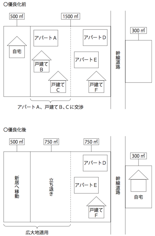 そこで、筆者は本人に、道路をへだてた反対側に新居を作ること提案しました。次に戸建てBとCに住む借家人とアパートAの入居者に交渉し、立ち退きをかけることにしました。借家人は別の場所に引っ越し、アパートAの入居者はアパートDやEにそれぞれ移ることで決着がつく見通しです。
