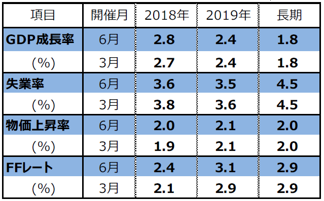 (注2)FOMCメンバーによる予測の中央値。GDPと物価上昇率は10-12月期の前年同期比。物価上昇率は2018年、2019年がPCEコア物価指数、長期はPCE物価指数の上昇率。失業率は10-12月期の平均値。FFレートは各年末時点における誘導レンジの中間値。