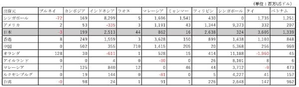 東南アジア諸国は日本への輸出を行っており、群を抜いているのはタイだ。その次に、ベトナム、マレーシア、フィリピン、カンボジアの順となっている。タイは日本製品の最大輸入国でもある。