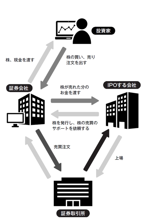 IPOでは上場する前に株式を発行し、ベンチャーキャピタルなどから資金を募り、日本円などの法定通貨で出資してもらいます。その後、資本政策の策定や経営体制の準備、申請書類の作成など、IPOに向けての準備と取引所が要求するIPOの基準を満たして初めて上場することができ、投資家は、上場する前に割安で買っていた株を、上場後に売却することで利益を得るという仕組みです。