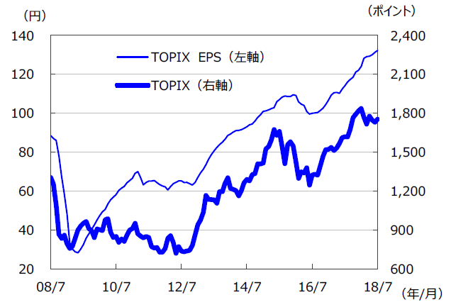 S&P500種指数の18年7月の1株当たり予想利益(EPS)は170.95米ドル(前年同月比+21.8%)と、21カ月連続で過去最高を更新し、かつ9カ月連続で前年同月比二桁の伸びとなりました。東証株価指数(TOPIX)の予想EPSは132.26円(同+15.9%)と、14カ月連続で二桁の伸びとなりました(いずれも予想はトムソン・ロイターズI/B/E/Sベース)。
