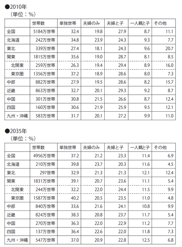 そして2035年には東京圏では4.8%に、近畿ブロックでは5.4%とさらに低下します。代わって「単独世帯」が東京圏では40.2%など、極めて高い水準になります。「単独世帯」と「夫婦のみ」で6割を超え、家族数2人以下の世帯が過半数を上回るわけです。反対に家族数3人以上のファミリー世帯は少数派に陥ります。