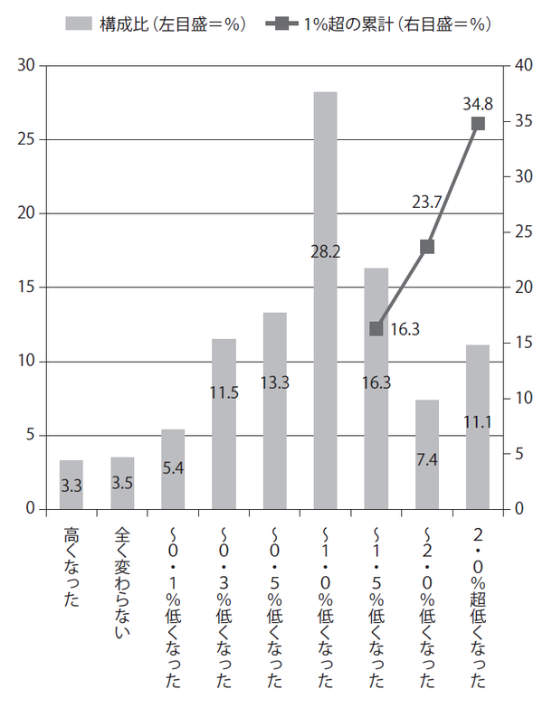 借り換えによる適用金利の変化を見ると、金利低下幅が0.5%以内という人は30.2%で、0.5%超1.0%以内が28.2%、1.0%超1.5%以内が16.3%などとなっています。借り換え前の金利より1%超低くなったという人も少なくありません。合計で図表1にあるように34.8%に達します。3人に1人は1%超の引き下げを手にしている計算です。