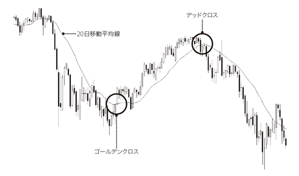 クロスの仕方は、現在の価格が移動平均線を下から上に抜けるか、上から下に抜けるかの2通りがありますが、前者を「ゴールデンクロス」、後者を「デッドクロス」といいます