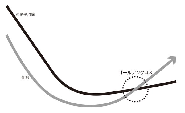 これが、最も典型的なゴールデンクロスです。まず、移動平均線がしばらく下降していること。次に、その移動平均線が下げ止まりを予兆させるものであること。この2つが大前提であり、その条件がそろっている状態で、移動平均線の下にあった価格が、移動平均線を上向きにはっきりとクロスする形になったときが、最大の買いのチャンスになります(図表1)。