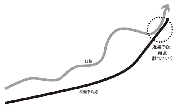 上昇トレンドにあるとき、価格が上昇力を失うと、価格と移動平均線は間隔を徐々に縮めていき、逆に価格が上昇力を強めているときは、価格と移動平均線の間隔が徐々に広がっ