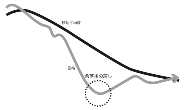 ここで下降していた価格が急落するなどすれば、価格は移動平均から乖離することになりますが、通常、そうした状態はいつまでも続くものではありません。急落した相場にはいずれリバウンドが入ります。それにより価格は、移動平均線に近づきます(図表4)。