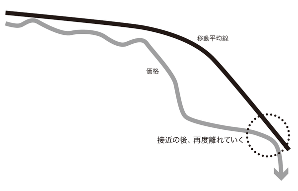 つまり、下降トレンドのときは、価格と移動平均線の位置関係を保ったまま、価格が移動平均線に接近したり離れたりするわけですから、このケースは、一度、下降力を弱めた相場が再度下降を開始したことを意味し、売りのチャンスだといえます(図表3)。