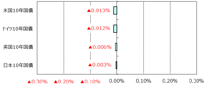 米国の10年国債利回りは、トルコ情勢や新興国市場の混乱などを背景に、週間では利回りが0.013%と小幅に低下しました。英国とドイツと日本の10年国債利回りも小幅に低下しました。
