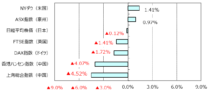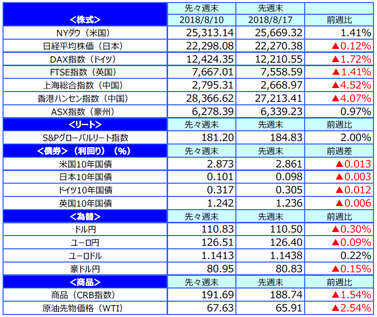 主要国の株式市場は米国や豪州市場を除き下落しました。米国株式市場は、週前半はトルコ情勢への警戒感や米中貿易摩擦の激化懸念で上値の重い展開となりました。週後半は米中首脳会談が11月にも開催される可能性があるとの報道を受けて米中貿易協議の再開期待が高まり上昇しました。NYダウは週間では1.41%上昇しました。日本株式市場では、日経平均株価は、週初はトルコリラの急落を受けた新興国通貨安を嫌気して、22,000円を割り込みました。翌日はリラ安が一服すると急反発しました。その後再び下落しましたが、米中貿易協議の再開期待が高まり反発し、週間では小幅な下落となりました。欧州株式市場では、トルコ情勢や中国の7月の主要経済指標が下ぶれたことなどを嫌気して、ドイツDAX指数は1.72%、英FTSE指数は1.41%下落しました。中国株式市場では、主要経済指標の下ぶれや人民元安への警戒感が高まり、上海総合指数、香港ハンセン指数はともに大幅に下落しました。