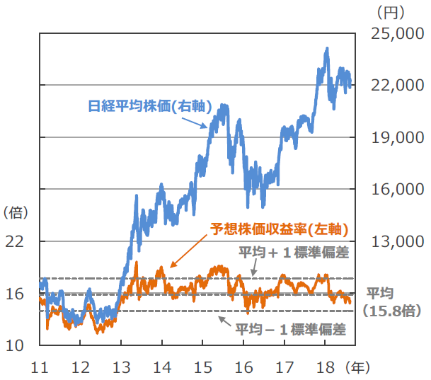 (注2)予想株価収益率=株価÷1株当たり予想利益。1株当たり予想利益は12カ月先予想。予想はBloomberg L.P.集計。予想株価収益率の平均値の計算期間は2011年1月4日~2018年7月31日。
