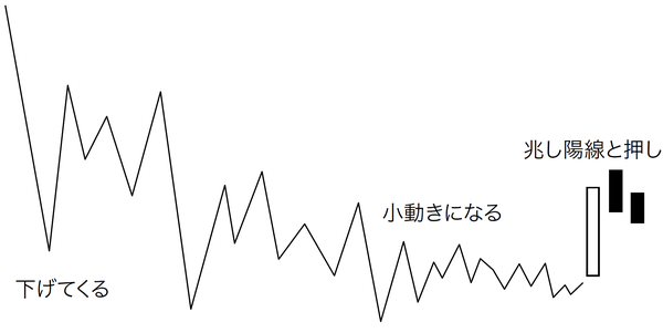 底練りの中で小動きになったあとの兆し陽線に注意。そのあとの陰線2本をみて買い