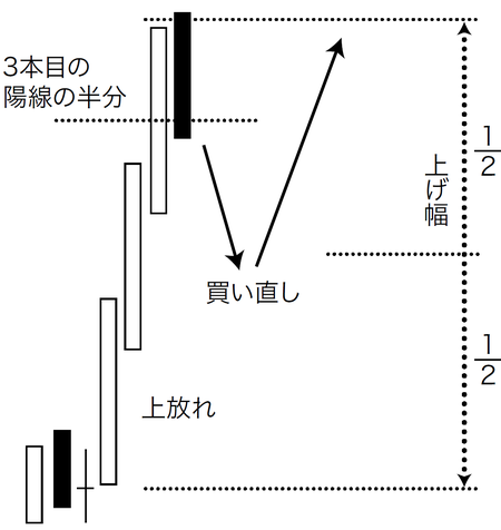 上放れ3陽線のあと3本目の陽線の半分以下に陰線が食い込んだら上げ幅の半分下がる
