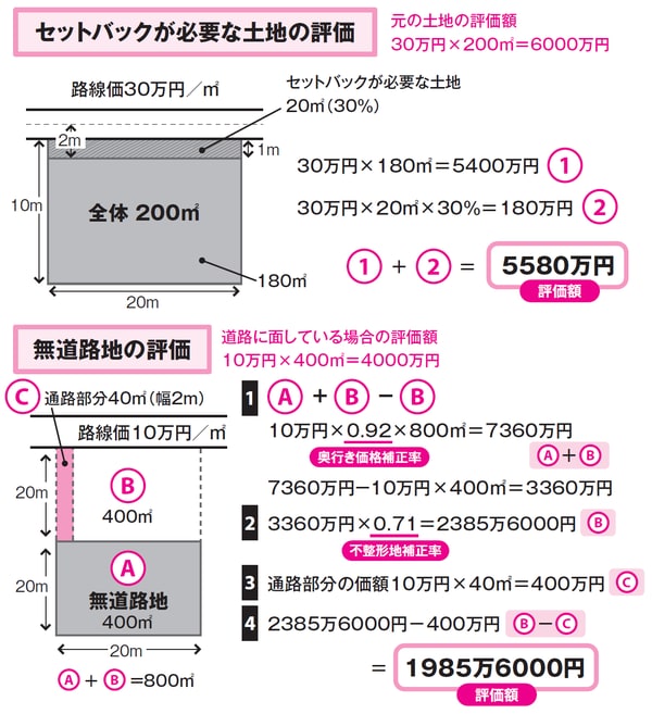 つまり、現状では宅地として使用していても、セットバック部分は将来的な道路予定地として、建築対象面積から除外されるため、通常の30%評価とします。道路に接していない土地の評価の仕方道路には、公の機関が設置するもの(公道)以外に、個人・法人などが所有しているもの(私道)があります。