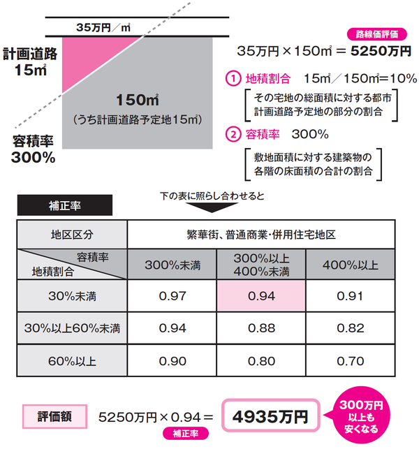 補正率表に従えば、たとえば、普通商業地区で容積率が300%以上400%未満に指定された土地で、土地全体に対する道路予定地の割合が30%未満の場合、補正率は0.94。つまり6%の減額とされます。