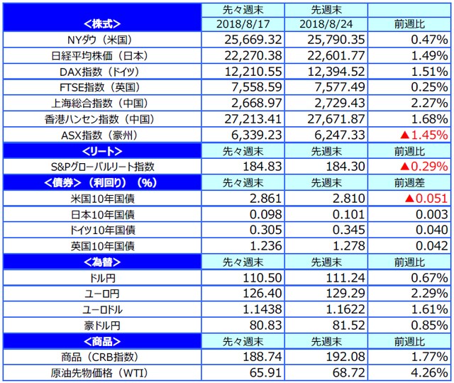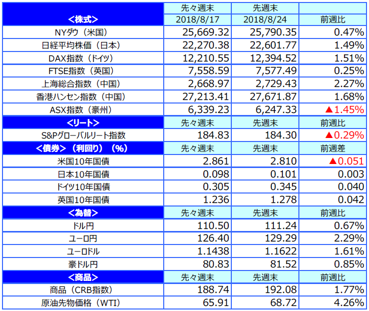 主要国の株式市場は豪州市場を除き上昇しました。米国株式市場は、米中双方が第2弾の追加関税を発動したことなど不透明感はありましたが、週末はパウエル米連邦準備制度理事会(FRB)議長の講演で緩やかな利上げスタンスが維持されたことで安心感が広がり上昇しました。NYダウは週間では0.47%上昇しました。S&P500とNASDAQ総合指数は高値を更新しました。日本株式市場では、新興国に対する過度な警戒が和らいだことや米国での9月の利上げが意識され、円安となったことなどを好感して上昇しました。週間では日経平均株価は1.49%上昇しました。欧州株式市場では、トルコや新興国に対する過度な警戒が和らいだことなどを受けて、ドイツDAX指数は1.51%、英FTSE指数は0.25%上昇しました。中国株式市場では、政府系機関による買い支え観測が支援材料となり、上海総合指数、香港ハンセン指数はともに上昇しました。米中双方が第2弾の追加関税を発動しましたが、影響は限定的となりました。豪州は首相交代に伴う政治的不透明感が嫌気され下落しました。