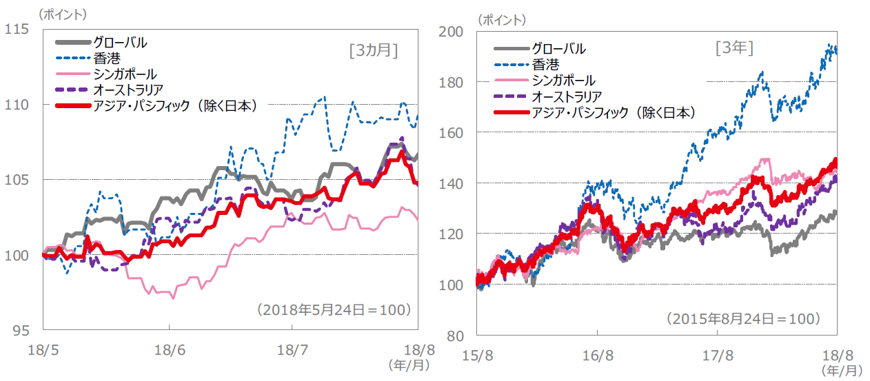 先週のアジアREIT市場は、香港市場は株式市場が堅調に推移したことが好感されて小幅に上昇しました。オーストラリア市場は、首相の交代を伴う政局混乱が嫌気されて大幅に下落しました。シンガポール市場は、小幅に下落しました。また、通貨は日米株式市場が堅調に推移し、円安・ドル高が進行したことを背景に対円で上昇しました。