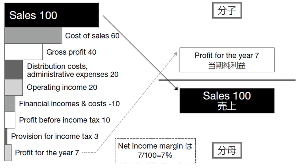 順子:先生、Operating income(営業利益)と Profit for the year(当期純利益)の間には、Financial incomes and costs(金融収益および費用)と、Provision for income tax(法人税)がありますので、投資や融資でお金を上手に増やそうとしている会社や、上手に節税している会社は Net income margin(当期純利益率)が高いっていうことですか?
