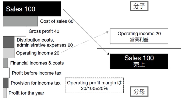 順子:Operating profit margin は、Operating income(営業利益)を Sales(売上)で割るんですね。つまり売上を100とした場合に、その何パーセントの営業利益を取れているかを見るんですね。