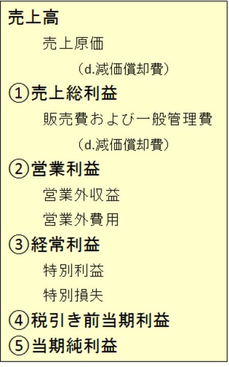 損益計算書は「十分な利益が得られているか」が分かりやすく整理されています。特に重要なのが損益計算書に表記される5つの利益のうち、「②営業利益」です。営業利益は本業で得られた利益額を表しており、プラスになっていればひとまず健全と言えます。
