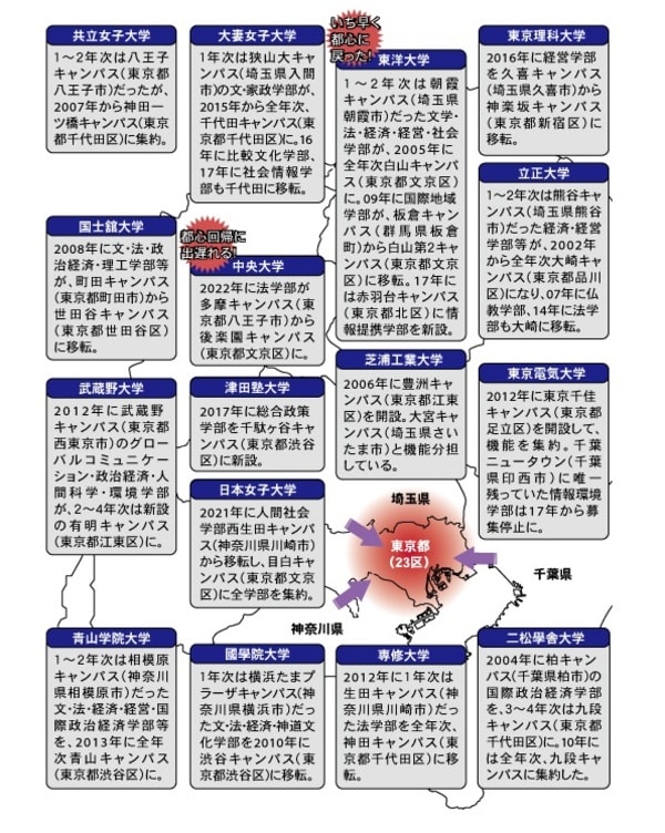 そして、このエリア最大の問題が、賃貸ニーズを支えていた企業の工場がより郊外や海外に移転し、さらに大学は学生獲得のため都心に移ってしまったことです。これは、2002年に工場等制限法という法律が廃止されたことに起因します。工場等制限法では、東京や大阪への人口集中を懸念し、このエリアでの1500㎡を超える大学の建設を禁止していました。しかし、この法律が廃止されたことによって、少子高齢化の世の中で利便性が高い都心にキャンパスを移転し、学生の確保を行う大学が増えたのです(下記図表2参照)。それにより、賃貸需要は次第に減ってきました。