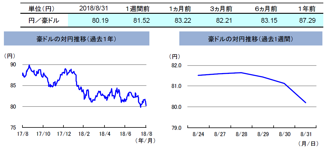 先週の豪ドルの対円レートは、下落しました。先週は、30日に発表された豪州の7月の住宅建設許可件数が市場予想よりも悪化しました。加えて、トランプ米大統領が来週にも中国からの輸入の2,000億ドル分に対して追加制裁関税を発動する可能性を示唆したためリスク回避姿勢が強まり、豪ドルの対円レートは下落しました。