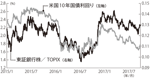 日本のインフレ期待を測る指標として、10年国債利回りが注目されていましたが、2016年9月に日銀がイールドカーブ・コントロール政策を導入し、10年国債利回りをゼロ%近辺に固定する政策を導入したため、10年国債利回りは指標性を失いました。その代わりに、日本の国債利回りが米国の国債利回りと相関が高いことに注目し、外国人投資家は米国の10年国債利回りを重視しています。東証銀行株指数の対TOPIX相対パフォーマンスと米国10年国債利回りは、高い相関があります(図表)。