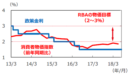 ■一方、18年4-6月期の消費者物価指数(異常値を除外したトリム平均値)上昇率は、前年同期比+1.9%と、豪州準備銀行(RBA)の目標レンジである+2~+3%の下限を下回っています。