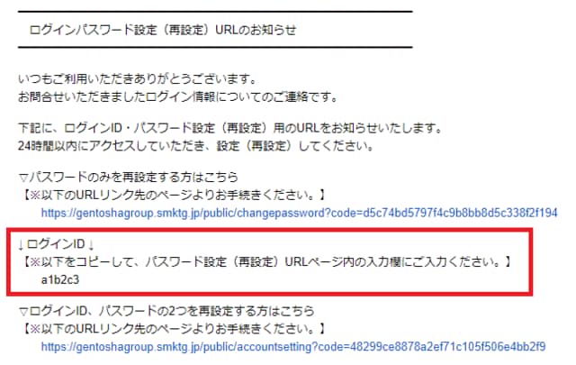 先ほどのメールに記載の「ログインID」をコピーし、パスワード設定URLページ内の入力欄にご入力ください。