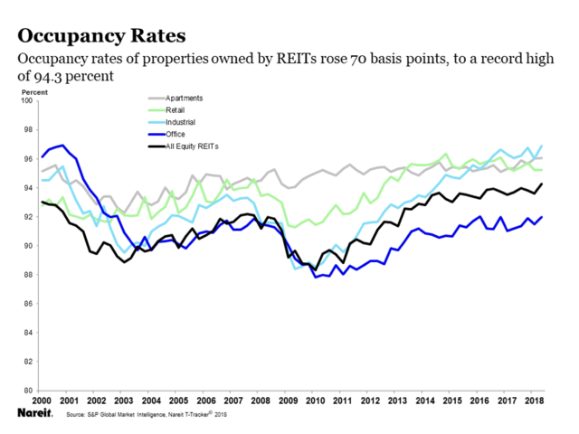 まずは、全米REIT協会が公表しているセクター別REIT保有物件の稼働率推移を見てみます。ここ数年、インダストリーREITのパフォーマンスは、共同住宅REITのそれを上回るようになりました。