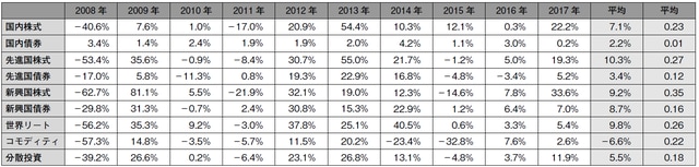 すると、商品(コモディティ)のみが、図表にある2008年~2017年の10年間において、平均リターンがマイナス6.6%とマイナスになっており、一人負けであったことが分かります。