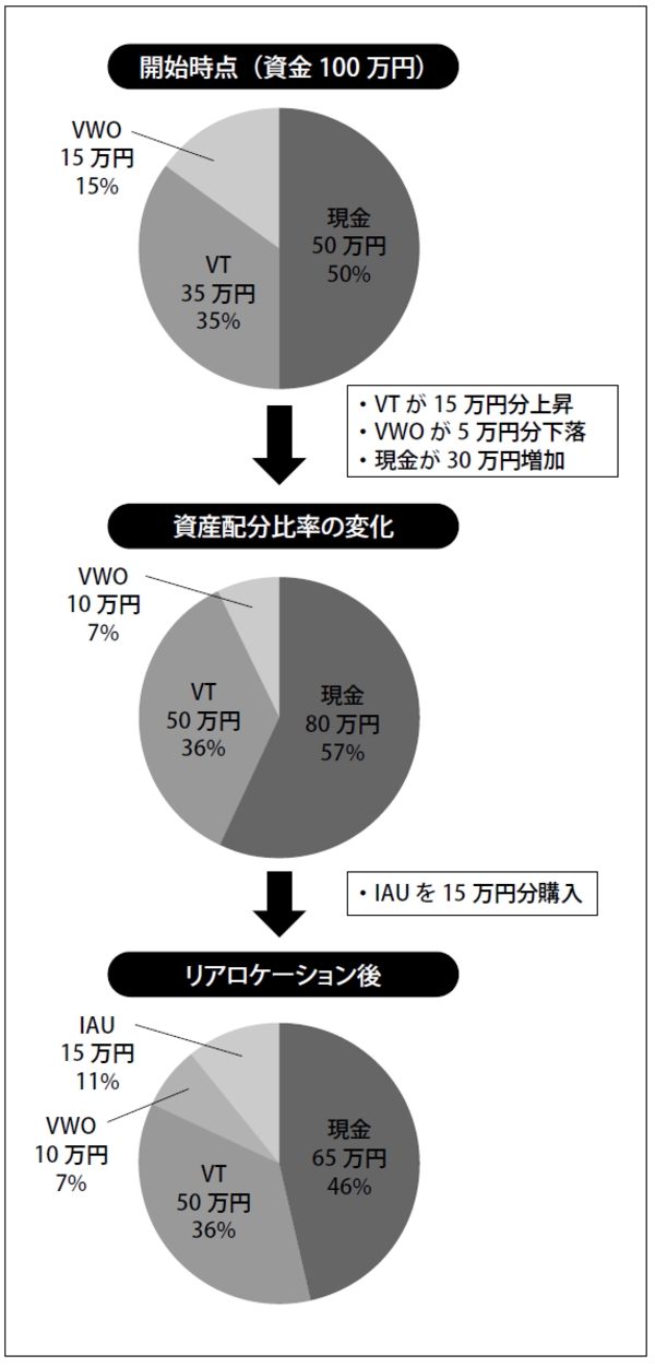 リバランスの例と同じく「運用資金100万円のポートフォリオ」をもとにして、リアロケーションの例を示したのが図表2です。