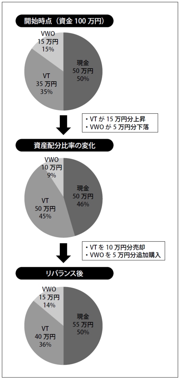 この図の真ん中にある円グラフにおいて、開始時点から「VT」が15万円分上昇し、「VWO」が5万円分下落したというのは、リバランスの例で示した場合と同様です。