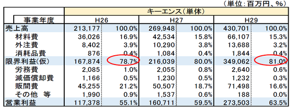 赤丸で囲んだ限界利益率に注目すると、約80%です。つまり、キーエンスは、例えば1つの製品を30,000円で販売した場合、その80%の28,000円分が利益増に貢献するという費用構造なのです。最低限の材料費等で製品を製造し、高い価格で販売できていると推察できます。製品力に強みがあると言えるでしょう。