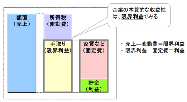 会社としては、稼いで得た手取り額(限界利益)から、人件費などの必要経費(固定費)を除いたものが、利益になります。