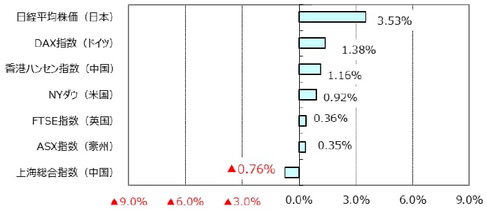 主要国の株式市場は概ね上昇しました。米国株式市場は、米中貿易摩擦の対話が再開されるとの期待や先週下落した半導体などハイテク株が反発したこともあり、上昇に転じました。物価指標が予想を下回り、利上げ加速懸念が後退したことも安心感につながりました。NYダウは週間では0.92%上昇しました。ハイテク株の比率の高いNASDAQ総合指数も1.36%上昇しました。日本株式市場は、トルコの利上げを受けて新興国リスクが後退したことや米中の通商交渉再開期待を背景に、先物に買い戻しが入り、日経平均は終値ベースで23,000円台を回復しました。日経平均株価は3.53%上昇しました。欧州株式市場は、トルコの利上げを受けて新興国リスクが後退したことなどを好感して、FTSE指数は0.36%上昇、ドイツDAX指数は1.38%上昇しました。中国株式市場は、米中貿易摩擦の不透明感が重石となり、上海総合指数は0.76%下落しました。香港ハンセン指数は1.16%上昇しました。