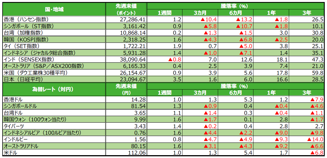 先週のアジア株式市場は、米中が貿易協議を再開するとの期待感が広がり、前週にアジア株式市場全般が下落していた反動から大半の市場が上昇しました。インド株市場は、週央にかけて通貨ルピーが売られたことから、週間では下落しました。また、主要なアジア通貨は、前述の米中協議への期待感や、トルコ中央銀行が政策金利を大幅に引き上げたことで、新興国通貨危機への警戒感が後退したことから対円で上昇しました。