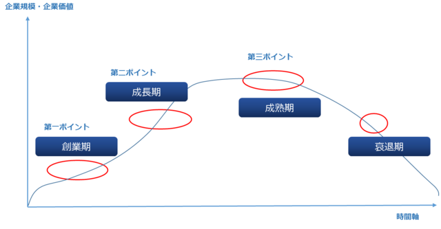 図表のように、企業も商品・サービスと同じくライフサイクルがあります。何もしなければ、この曲線から下ブレ、低迷するのが一般的です。それぞれのステージで、どのようなM&A戦略が効果的かを説明します。
