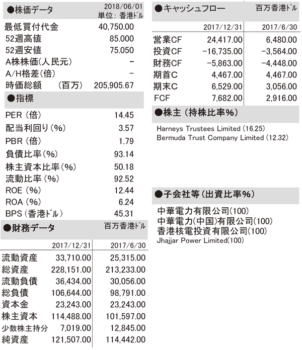 17年12月期(本決算)は16%増収、12%増益。主力の香港事業が堅調だった。同事業の営業利益は2.6%増の88億6300万香港ドルに伸びている。売電量は0.2%減少したものの、供給世帯の増加などでカバーした。また、豪州、インドの両市場でも利益が拡大。うち豪州事業では、営業利益が48.1%増の27億3800万香港ドルに膨らんだ。インド事業の営業利益は、前年を38.0%上回る6億4700万香港ドルに達している。